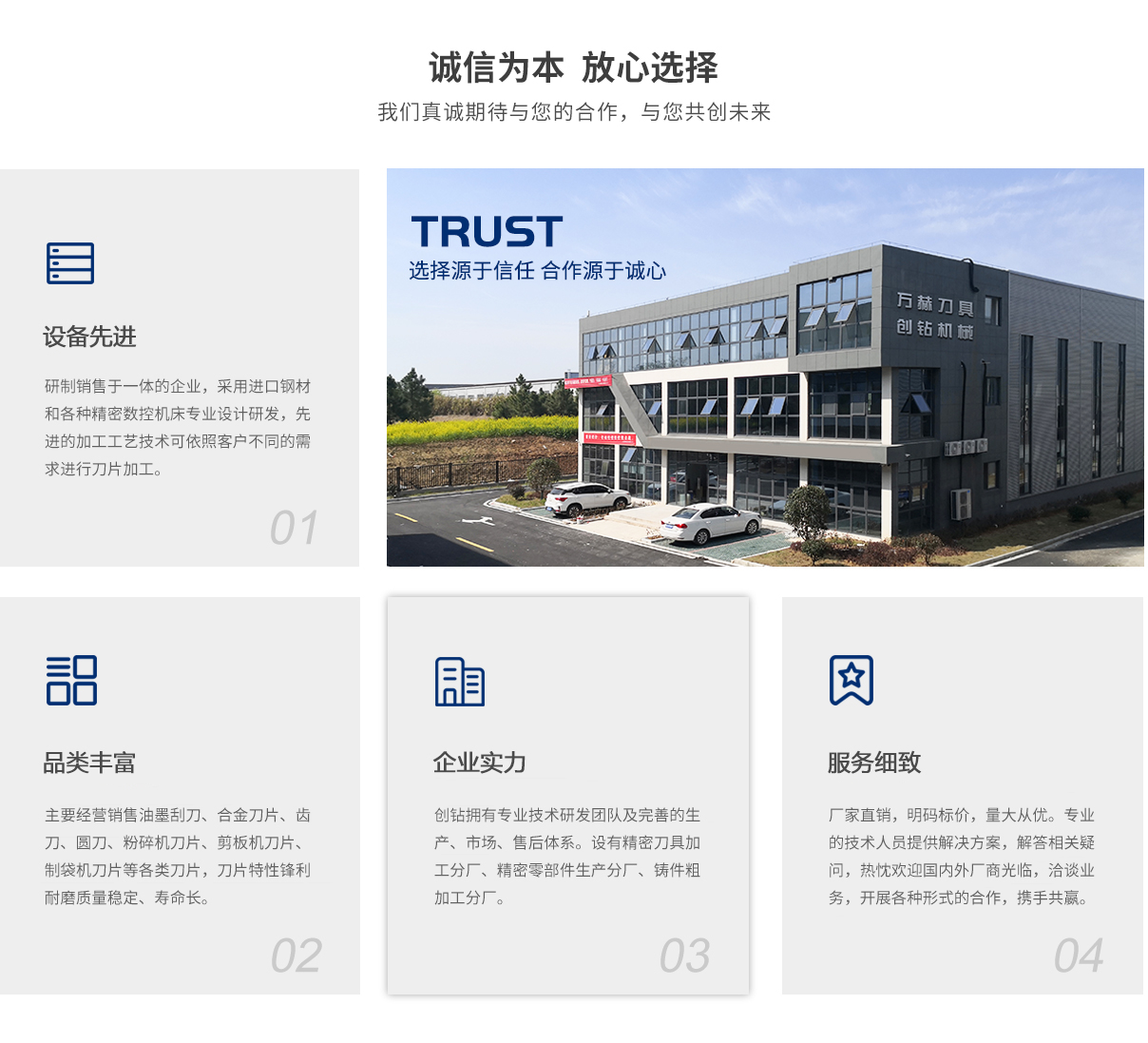 馬鞍山創鉆機械科技有限公司 INTRODUCTION 馬鞍山市創鉆機械科技有限公司(創鉆機械)坐落于鋼鐵之城-安徽馬鞍山,公司擁有專業的技術研發團隊及完善的生產、市場、售后體系。公司設有精密刀具加工分廠、精密零部件生產分廠、鑄件粗加工分廠,...
